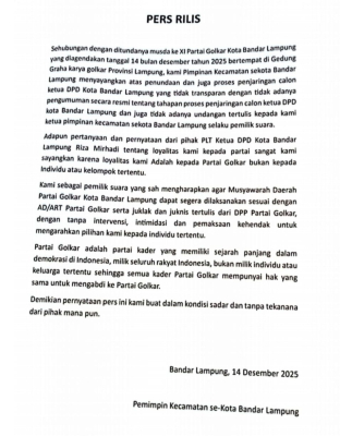 Kekecewaan atas penundaan Musda XI Partai Golkar Kota Bandar Lampung dituangkan dalam “PERS RILIS” yang dikeluarkan pada hari Minggu, 14/12/2025 oleh Pimpinan Kecamatan Partai Golkar Se-Kota Bandar Lampung.